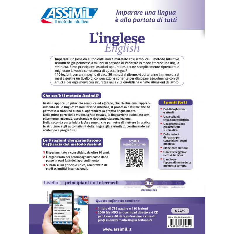 Questo corso è basato sull’originale Metodo Intuitivo, che permette di acquisire in modo naturale e progressivo le lingue straniere proprio come da bambini abbiamo appreso la nostra: mantenendo un ritmo di studio costante di solo 30 minuti al giorno, attraverso i dialoghi audio, le note grammaticali e gli esercizi, lezione dopo lezione potrai raggiungere, in circa cinque mesi, un livello di conoscenza intermedio della lingua inglese (B2 del QCER) ben consolidato, sia nell’orale (Listening, Speaking) che nello scritto (Writing). I corsi Assimil sono adatti anche per la preparazione autonoma agli esami accademici e certificanti.