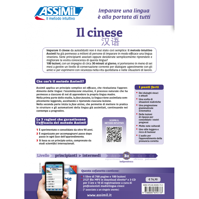 Il cinese è parlato da più di un miliardo di persone e comprende oltre 50 dialetti, ma come sempre il corso è riferito alla lingua ufficiale: l’Hanyu (cinese mandarino). Nel metodo Assimil viene mantenuto l’intento di insegnare la lingua parlata, perciò tutti i testi sono presentati sia in scrittura a ideogrammi che in Pinyin (trascrizione alfabetizzata).