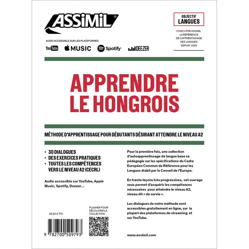 Apprendre le hongrois. Raggiungi il livello A2 di ungherese con il corso per principianti Assimil: 30 dialoghi, grammatica, esercizi e audio in streaming.