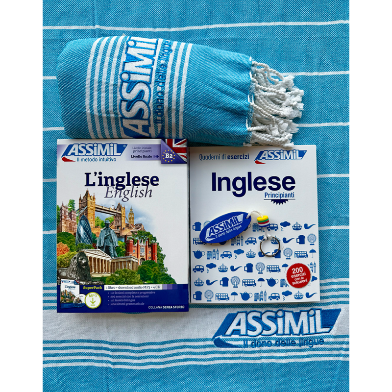 Con il Summer Pack di Inglese, impara o consolida la lingua mentre ti rilassi sotto l'ombrellone e ricevi in regalo un esclusivo telo mare in cotone e il portachiavi galleggiante Assimil.
