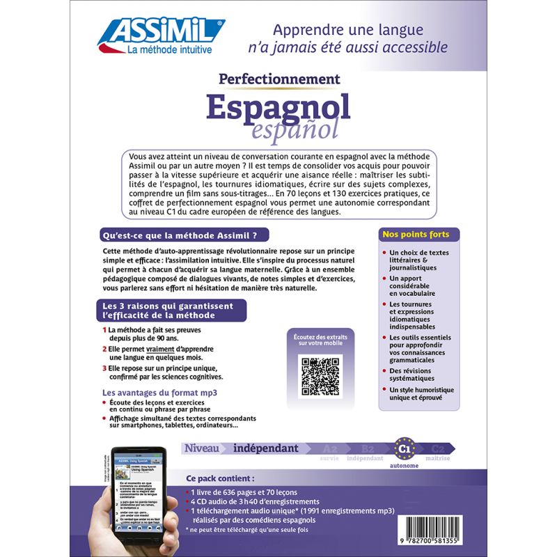 Con il corso avanzato con incisioni audio Assimil puoi perfezionare il tuo livello di spagnolo, approfondendo gli aspetti di sintassi, espressioni idiomatiche, sottigliezze linguistiche e lessico.