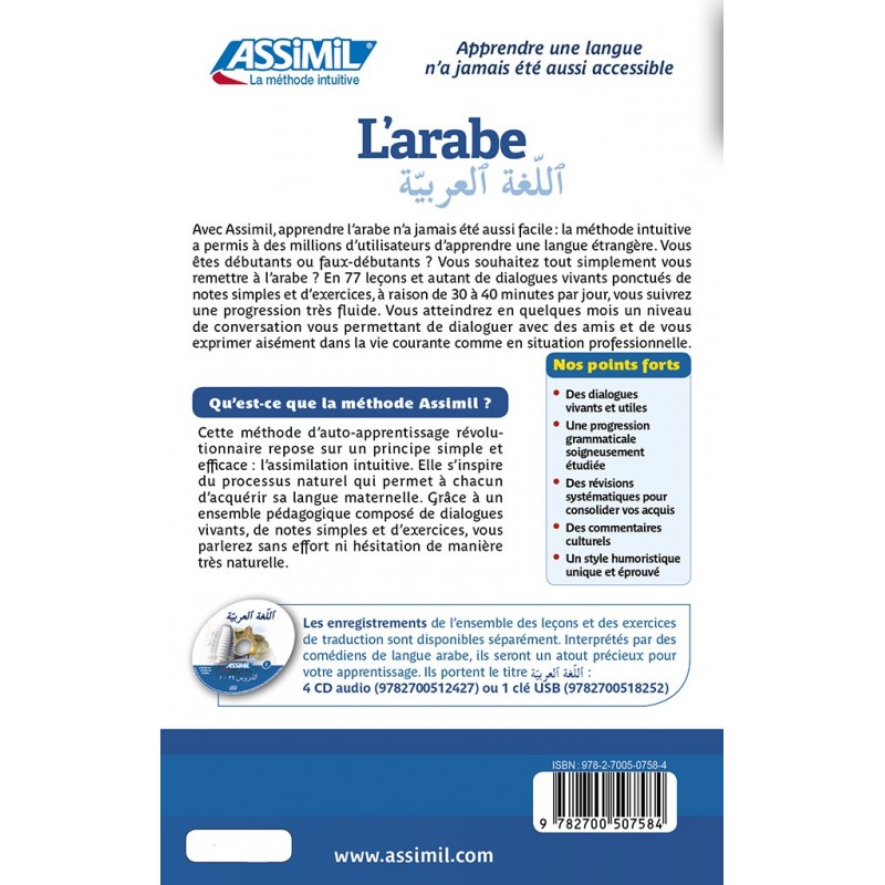 Grazie a questo corso, strutturato secondo il Metodo Intuitivo Assimil, potrai imparare la lingua araba da autodidatta e farti comprendere in tutto il mondo arabo, sia che tu sia un principiante assoluto o che tu voglia consolidare o migliorare il tuo livello di arabo.