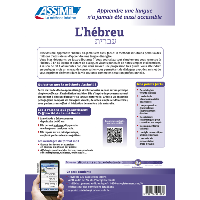 L’ebraico dei nostri giorni è uno dei rari esempi di lingua ritornata viva dopo che per lungo tempo ha cessato di esserlo. Affondando le sue radici nell’Antico Testamento, l’ebraico moderno, come ogni lingua viva, non ha mai smesso di evolversi e quindi di divenire alla portata di tutti. Ecco perché oggi non è più così difficile accostarsi a essa e, grazie al metodo Assimil, riuscirai in qualche mese a padroneggiare sia la lingua che la scrittura tuttora utilizzate in Israele.