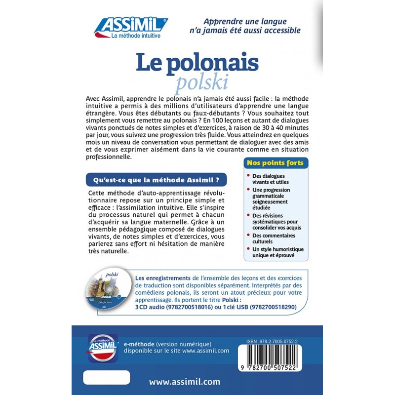Se stai cercando un corso per apprendere la lingua polacca in maniera semplice ed efficace, il corso di base di polacco su base francese del Metodo Intuitivo Assimil è lo strumento necessario per il tuo studio autodidattico.