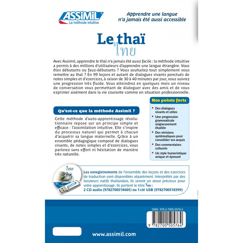 Se stai cercando un corso su base francese per imparare la lingua thai in maniera rapida ed efficace, il metodo naturale e intuitivo Assimil risulterà semplice e progressivo e lo studio verrà reso più gradevole dalle notizie culturali sul Paese, facilitando notevolmente le relazioni con gli abitanti e permettendo l’integrazione nella vita locale. Anche chi è spinto dalla semplice curiosità intellettuale potrà addentrarsi in una lingua legata a una cultura ricca e a una filosofia esistenziale molto profonda, dove la conoscenza dell’animo umano e le relazioni tra gli individui giocano un ruolo fondamentale nella vita degli uomini.