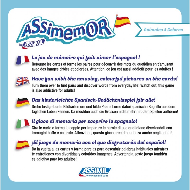 Le mie prime parole in Spagnolo. Il gioco memory educativo Assimil sullo Spagnolo per bambini dai 4 ai… 99 anni! Impara giocando i nomi di animali e colori.
