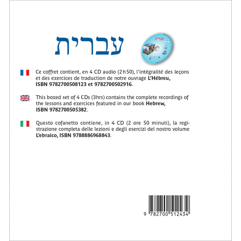 Solo 4 CD audio abbinati al volume L'ebraico- Collana Senza Sforzo (ISBN: 9788885695207 e precedente 9788886968843) e al volume L'Hébreu- Collection Sans Peine (ISBN: 9782700508123 e 9782700502916)e al volume Hebrew- With Ease Series (ISBN: 9782700505382).