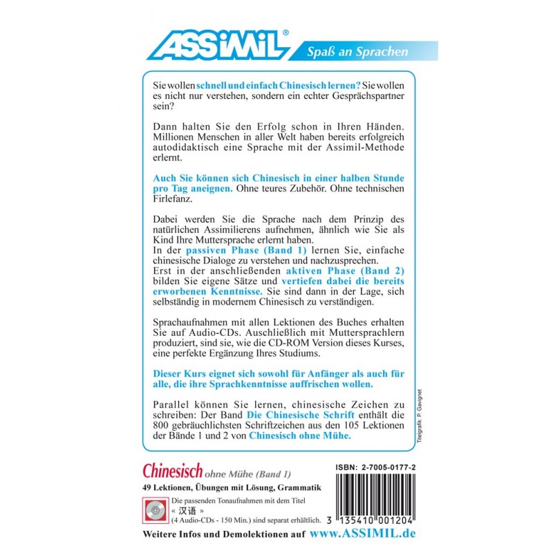 Se vuoi imparare il mandarino, tutte le sue particolarità linguistiche, dall’imparare a scrivere i caratteri cinesi a pronunciarli, scegli il corso su base tedesca del Metodo Intuitivo Assimil. Nel metodo Assimil viene mantenuto l’intento di insegnare la lingua parlata, perciò tutti i testi sono presentati sia in scrittura a ideogrammi che in Pinyin (trascrizione alfabetizzata).