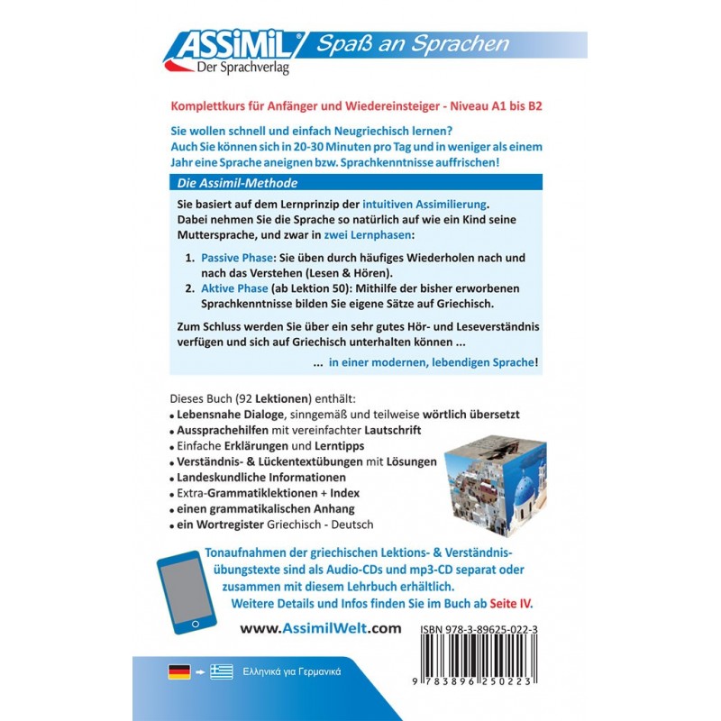 Se stai cercando un corso su base tedesca per imparare la lingua greca in maniera rapida ed efficace, il metodo naturale e intuitivo Assimil risulterà semplice e progressivo. Potrai imparare la lingua greca da autodidatta, sia che tu sia un principiante assoluto o che tu voglia consolidare o migliorare le tue competenze del greco.