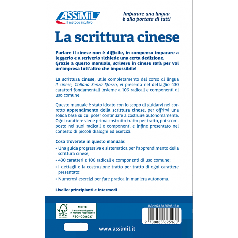 Utile strumento guida per imparare la scrittura cinese: 430 caratteri fondamentali, 106 radicali, carattere tratto per tratto, esempi, dialoghi ed esercizi.
